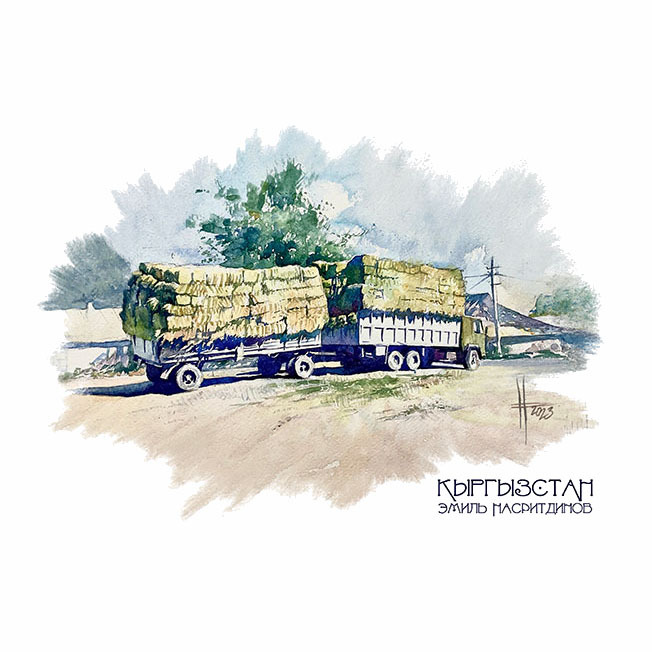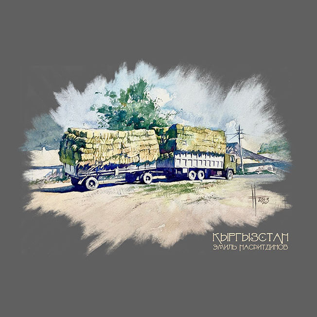 Данная акварель написана по фото талантливого болгарского путешественника и фотографа Юрия Боянина. Она показывает туманное утро в горах и грузовик с вещами семьи, перекачивающей на летние пастбища - жайлоо. Поверх всех вещей лежит красный тундук - центр купола юрты.