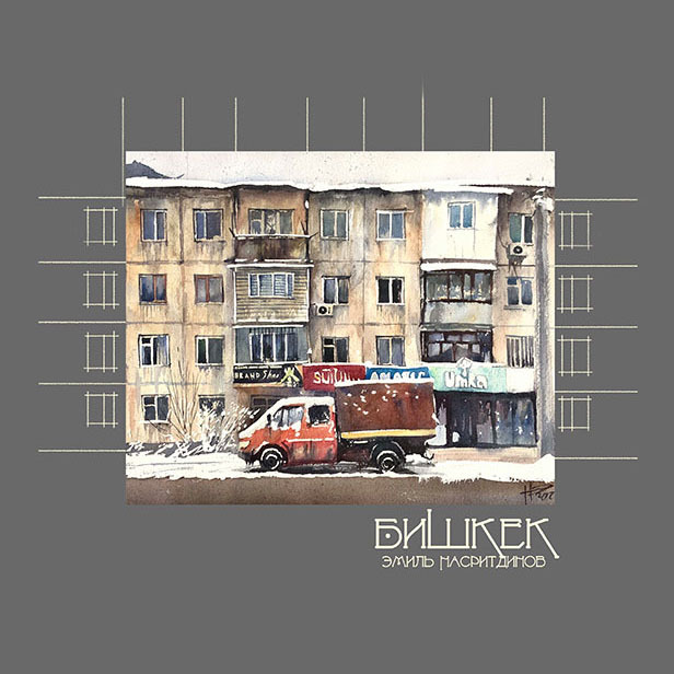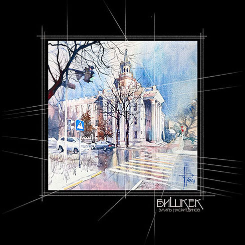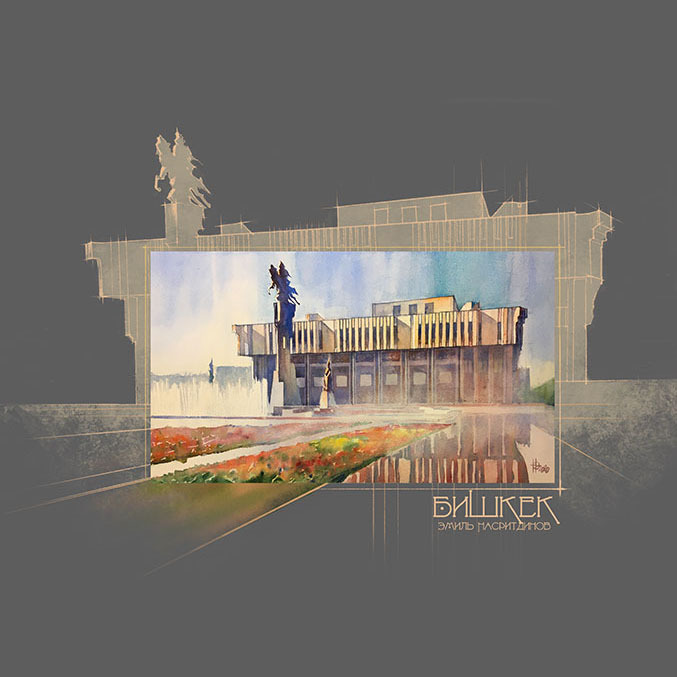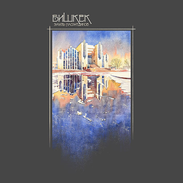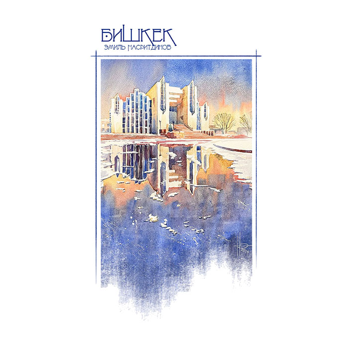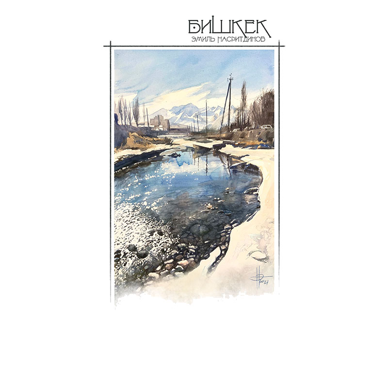 The author lives in the 9th microdistrict near the Ala-Archa River. The water and beautiful views of the mountains make it an excellent subject for watercolors. The river is especially beautiful in winter.